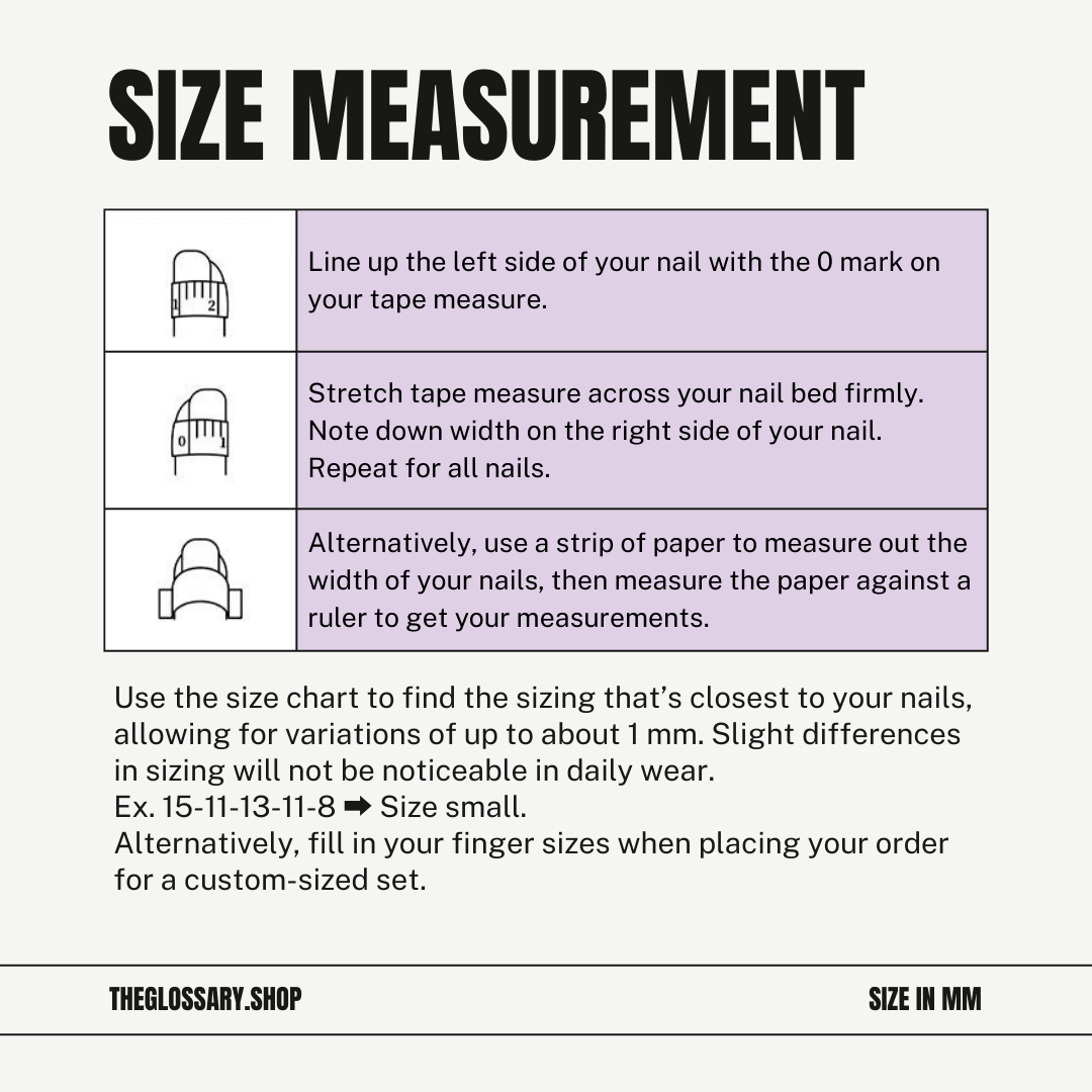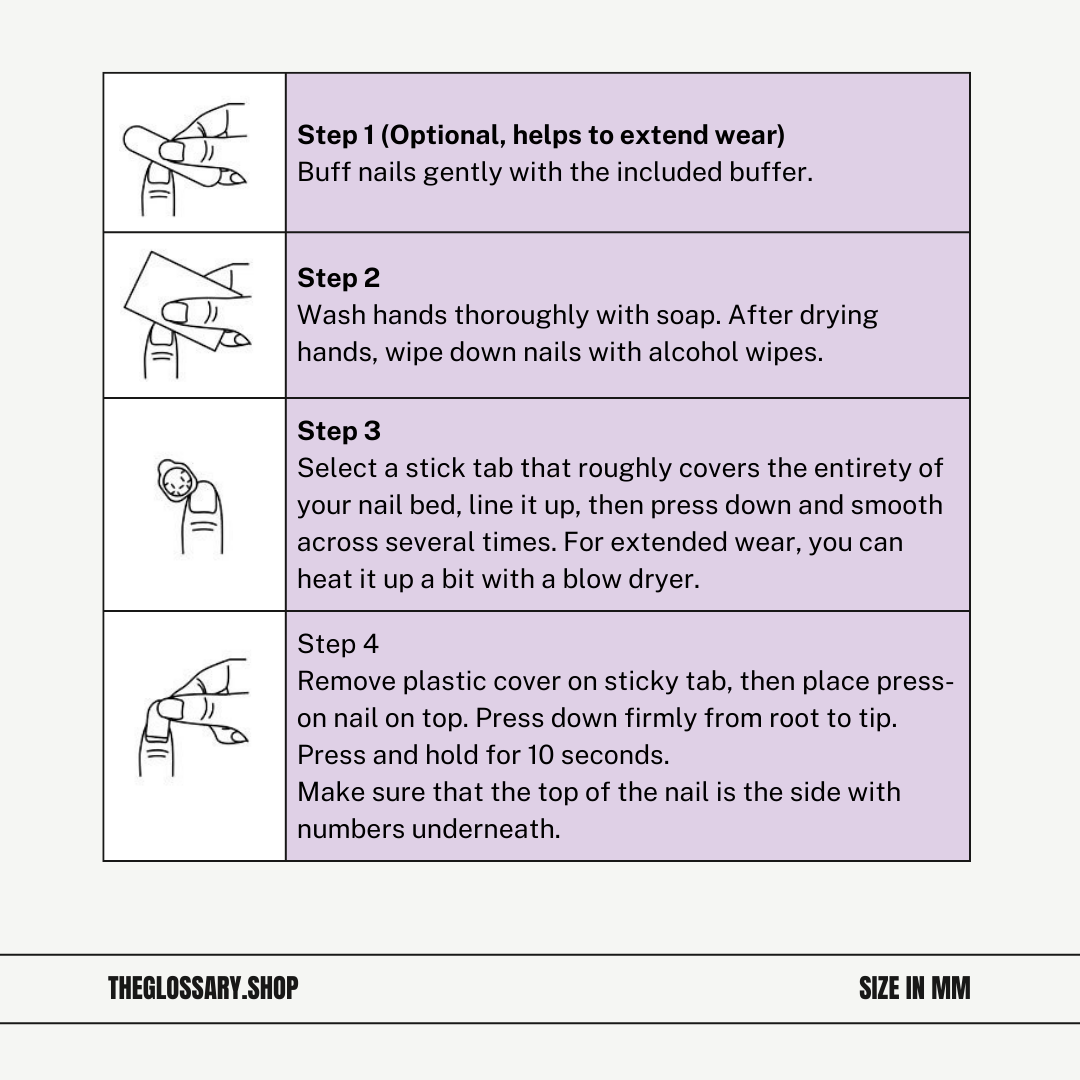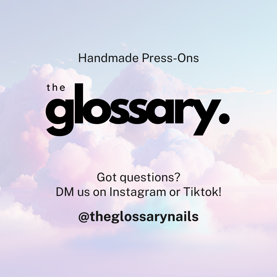 The Glossary stocks only handmade, high-quality gel press-ons. Our nails are made with the exact same steps and materials as gel manicures in salons, which means we are just as glossy as real gel manicures (unlike factory-made plastic press-ons), and even more sturdy — when worn with sticky tabs, our nails can be re-worn as many times as you like.